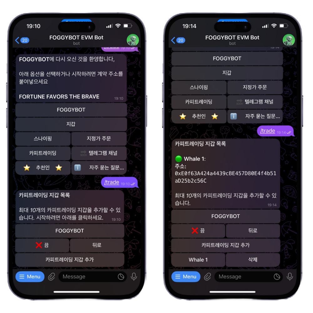 In the message you will see a list of the wallets you are copytrading if you have any. You can turn Copytrading ✅ ON/ ❌ OFF by clicking the button and you can create copytrades by clicking ‘Add Copytrade Wallet’.