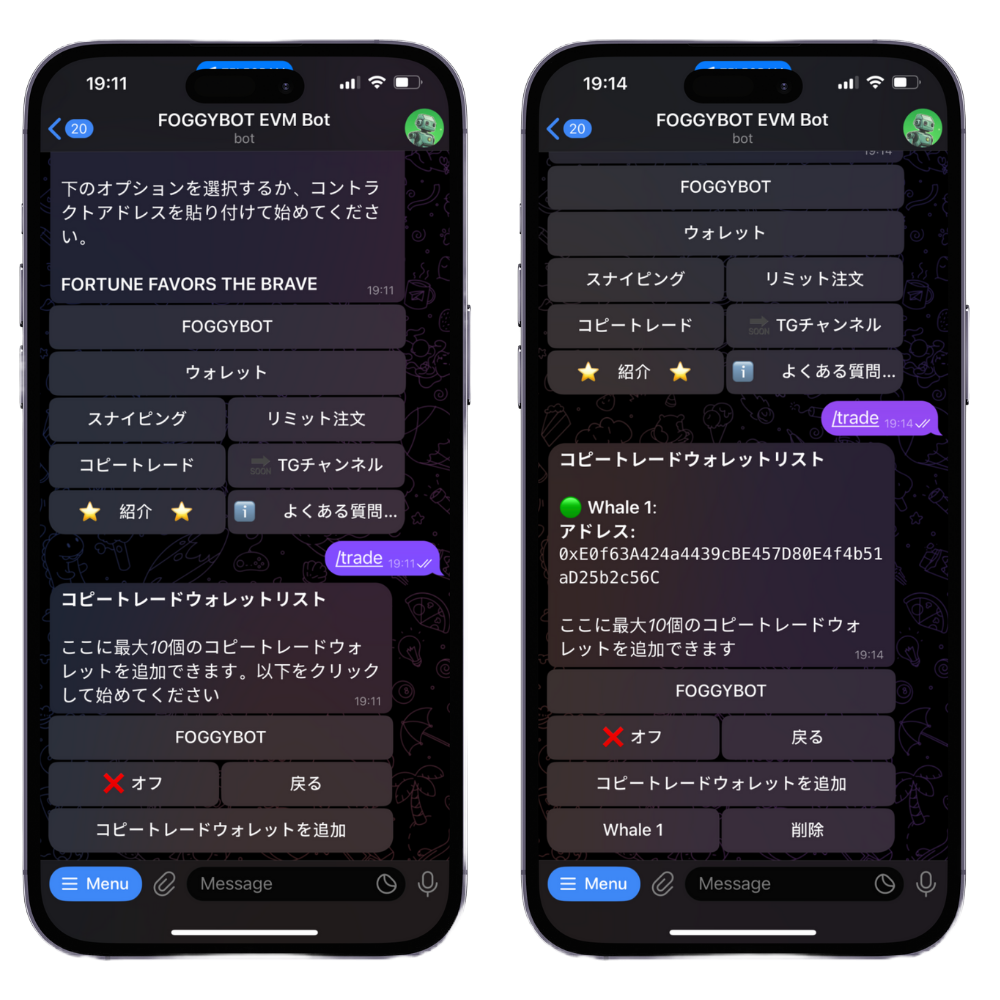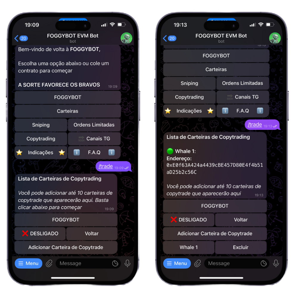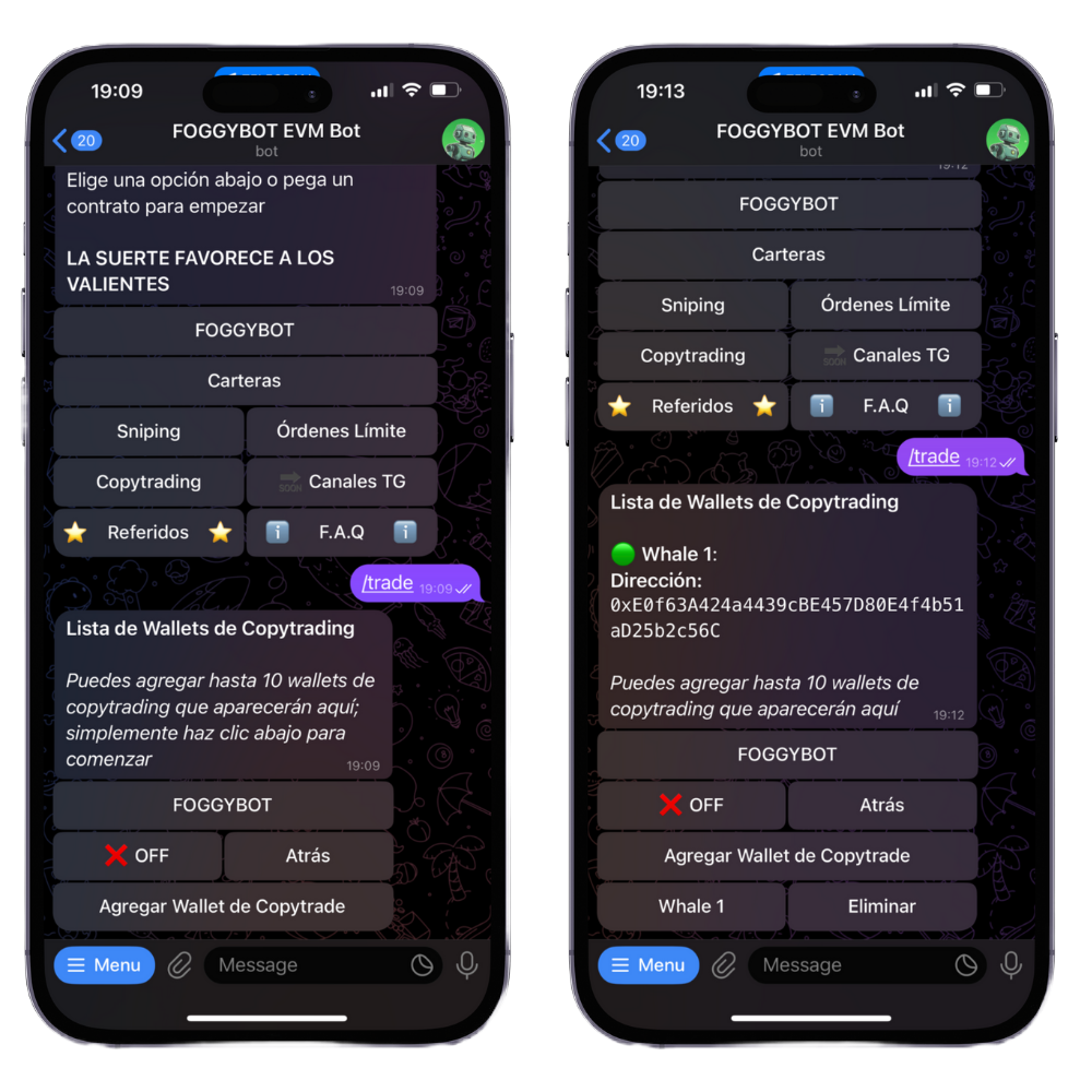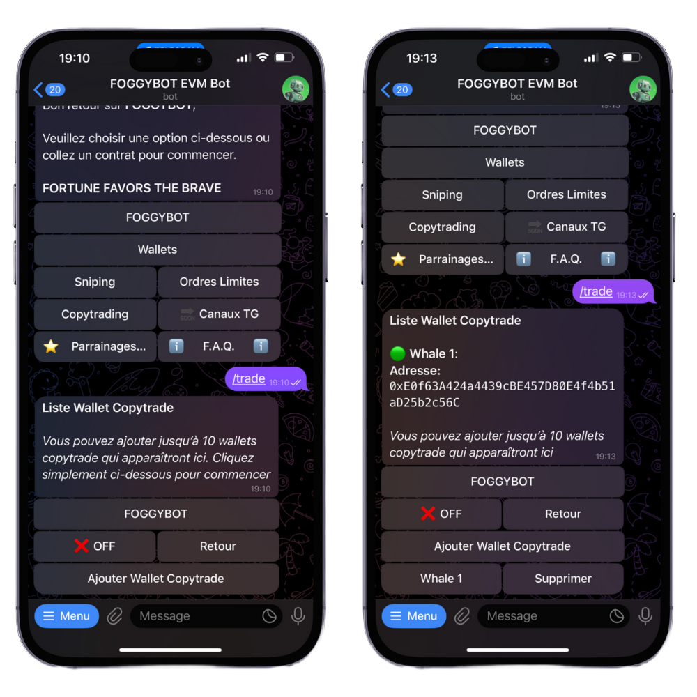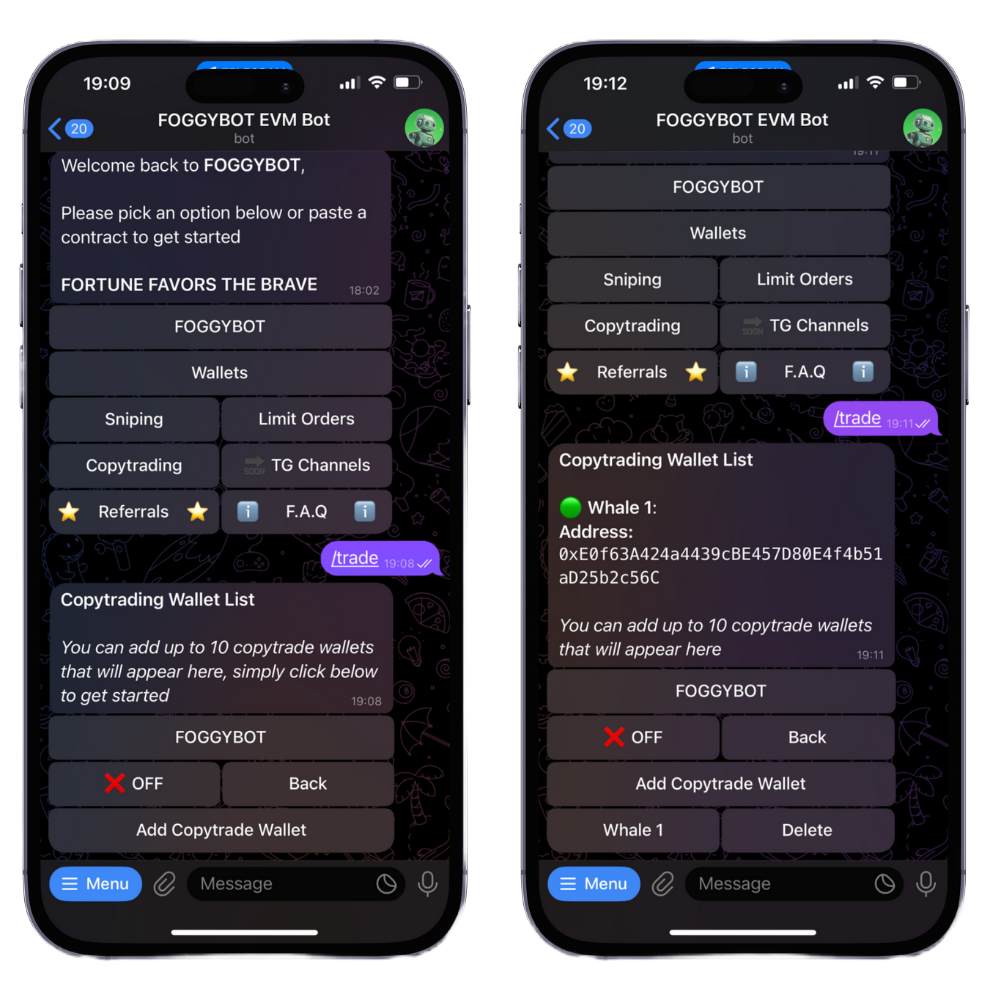 In the message you will see a list of the wallets you are copytrading if you have any. You can turn Copytrading ✅ ON/ ❌ OFF by clicking the button and you can create copytrades by clicking ‘Add Copytrade Wallet’.