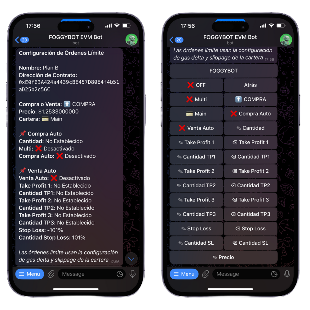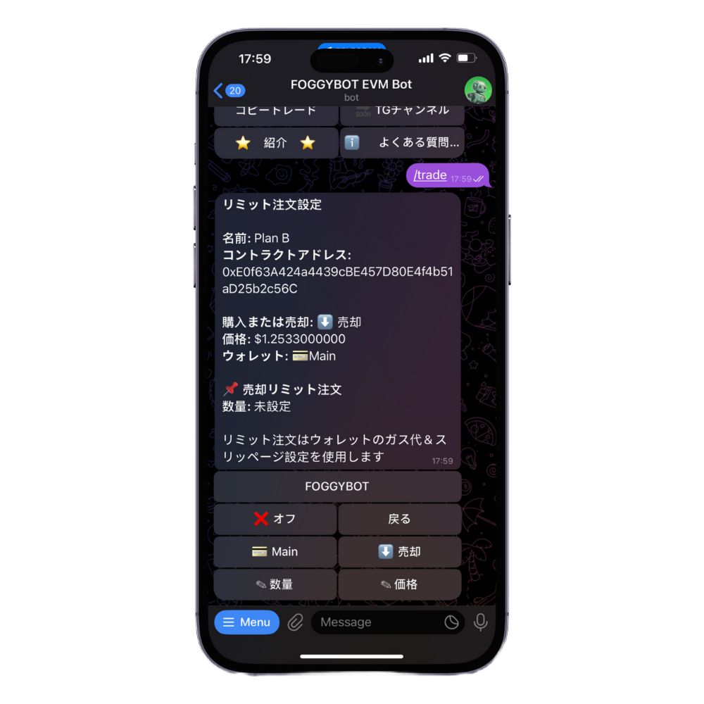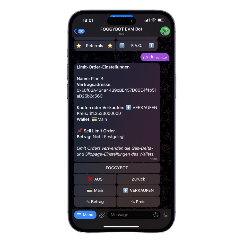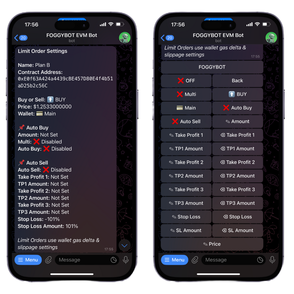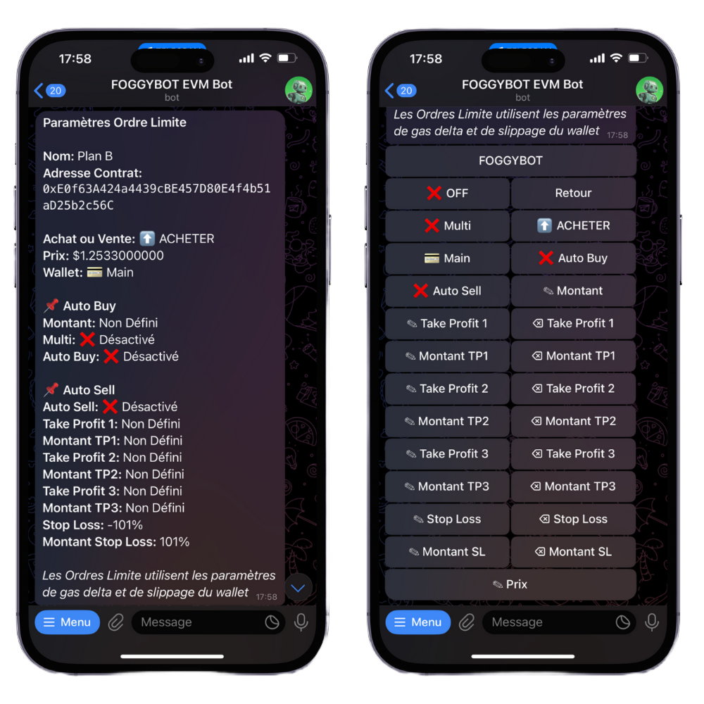 In the message you will see a list of your current limit orders if you have any. You can turn Limit Orders ✅ ON/ ❌ OFF by clicking the button and you can create limit orders by clicking ‘Add Limit Order’.