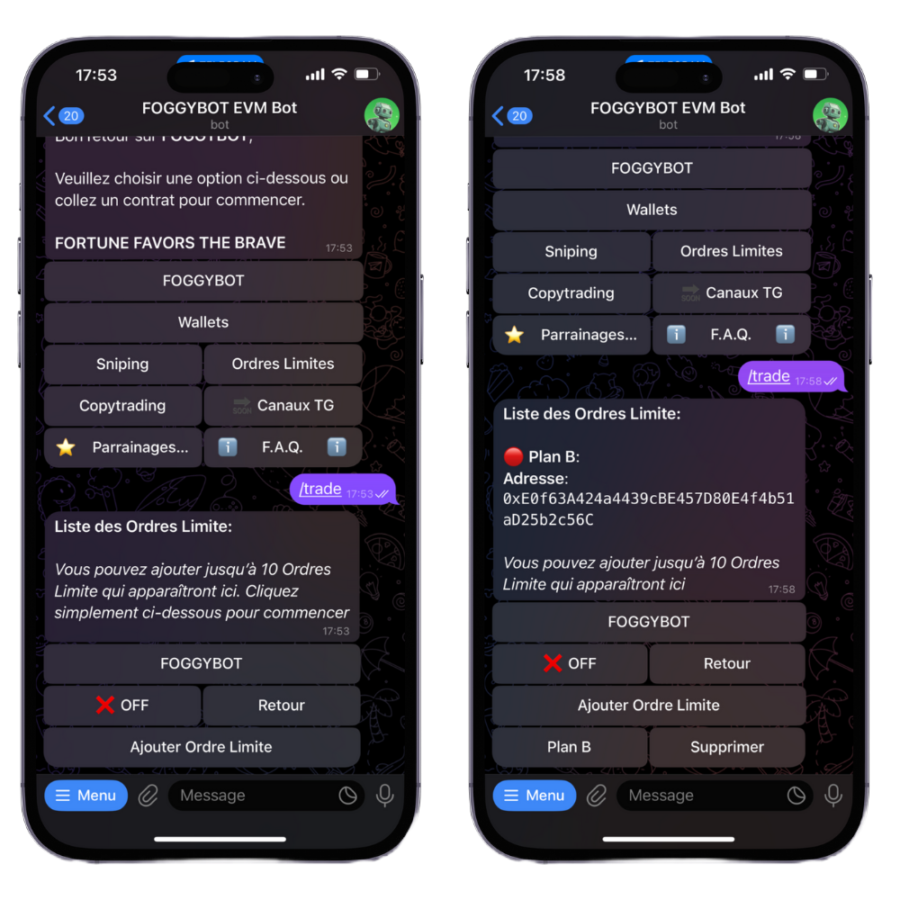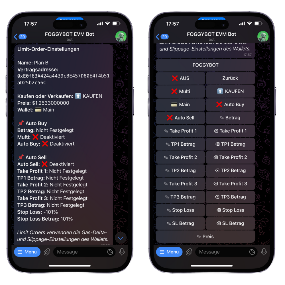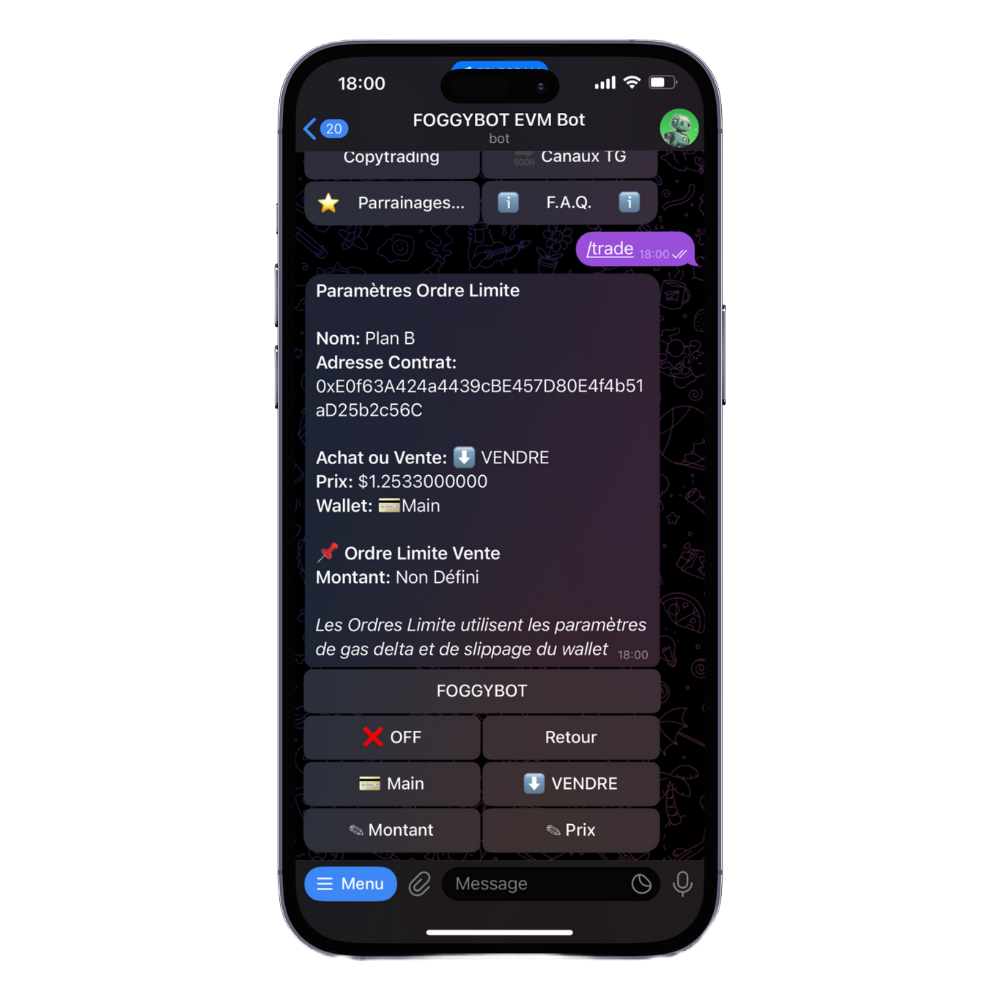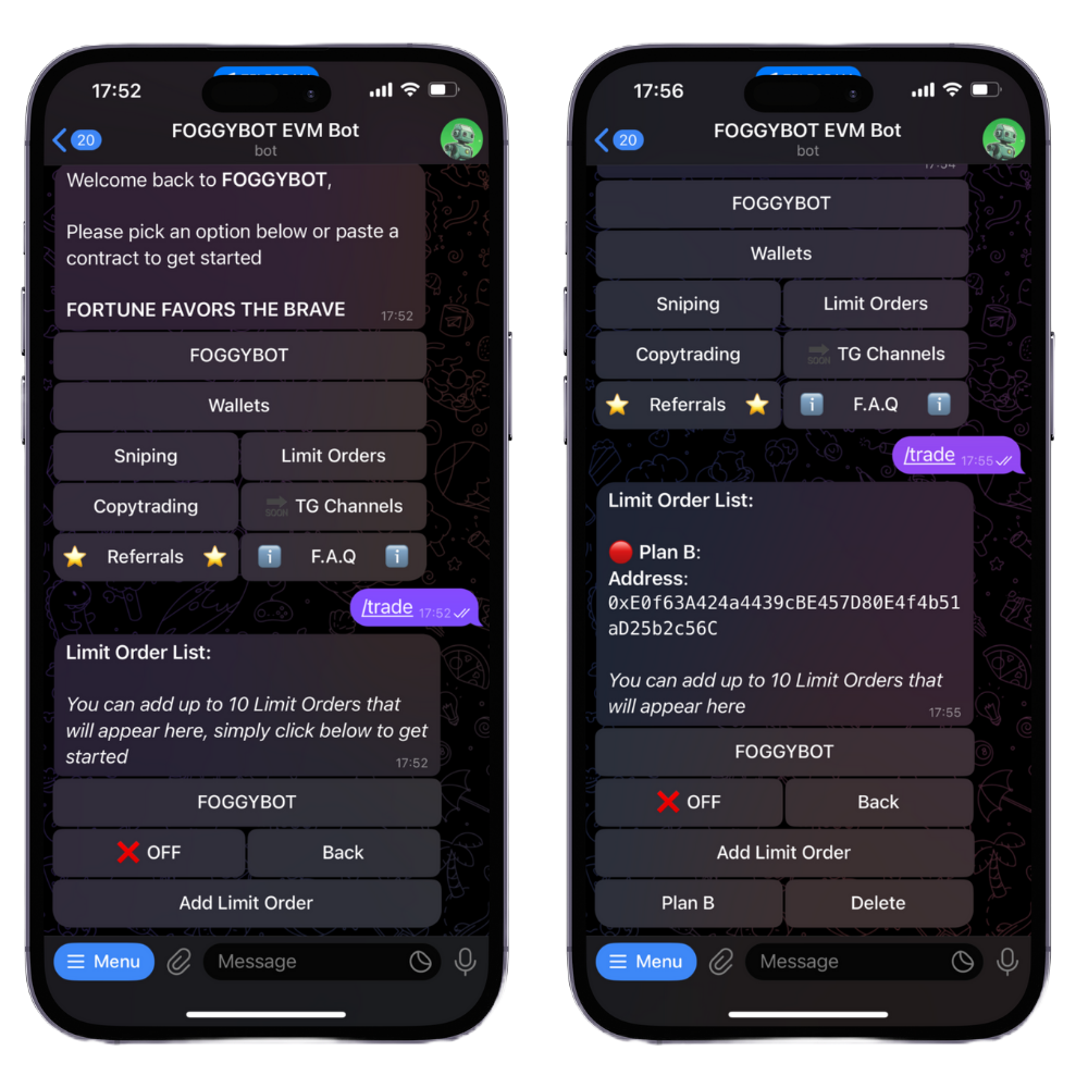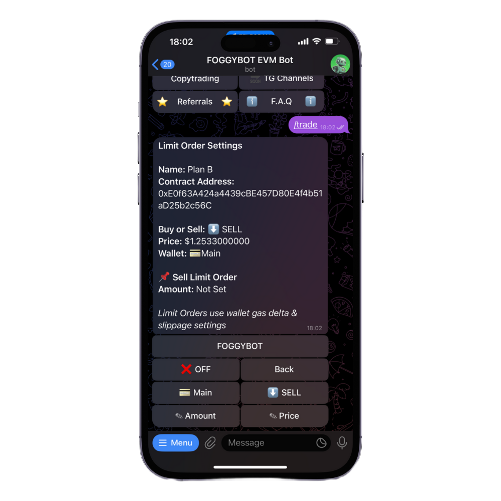 In the message you will see a list of your current limit orders if you have any. You can turn Limit Orders ✅ ON/ ❌ OFF by clicking the button and you can create limit orders by clicking ‘Add Limit Order’.