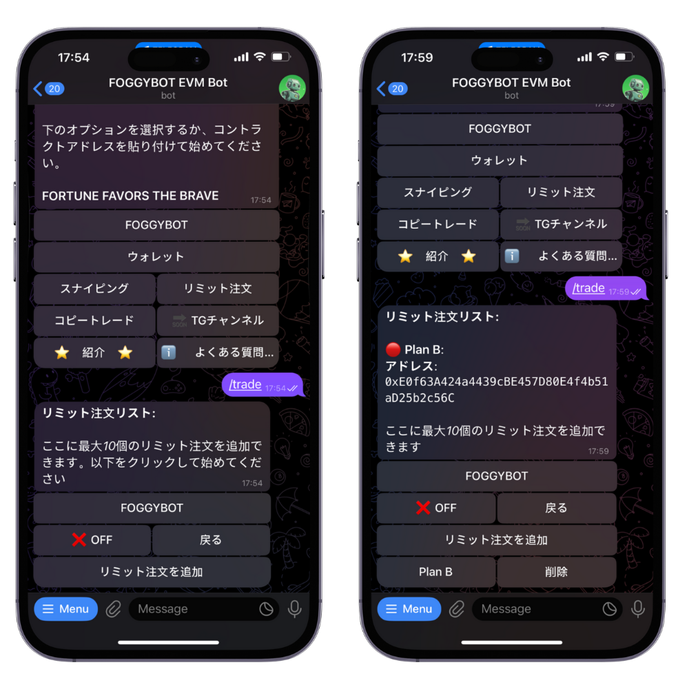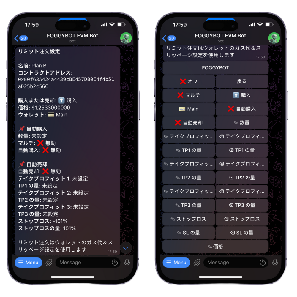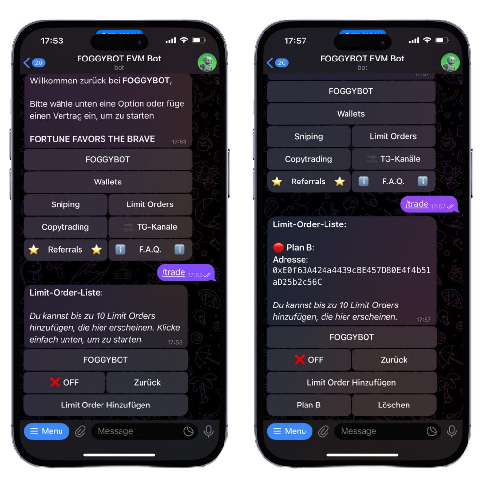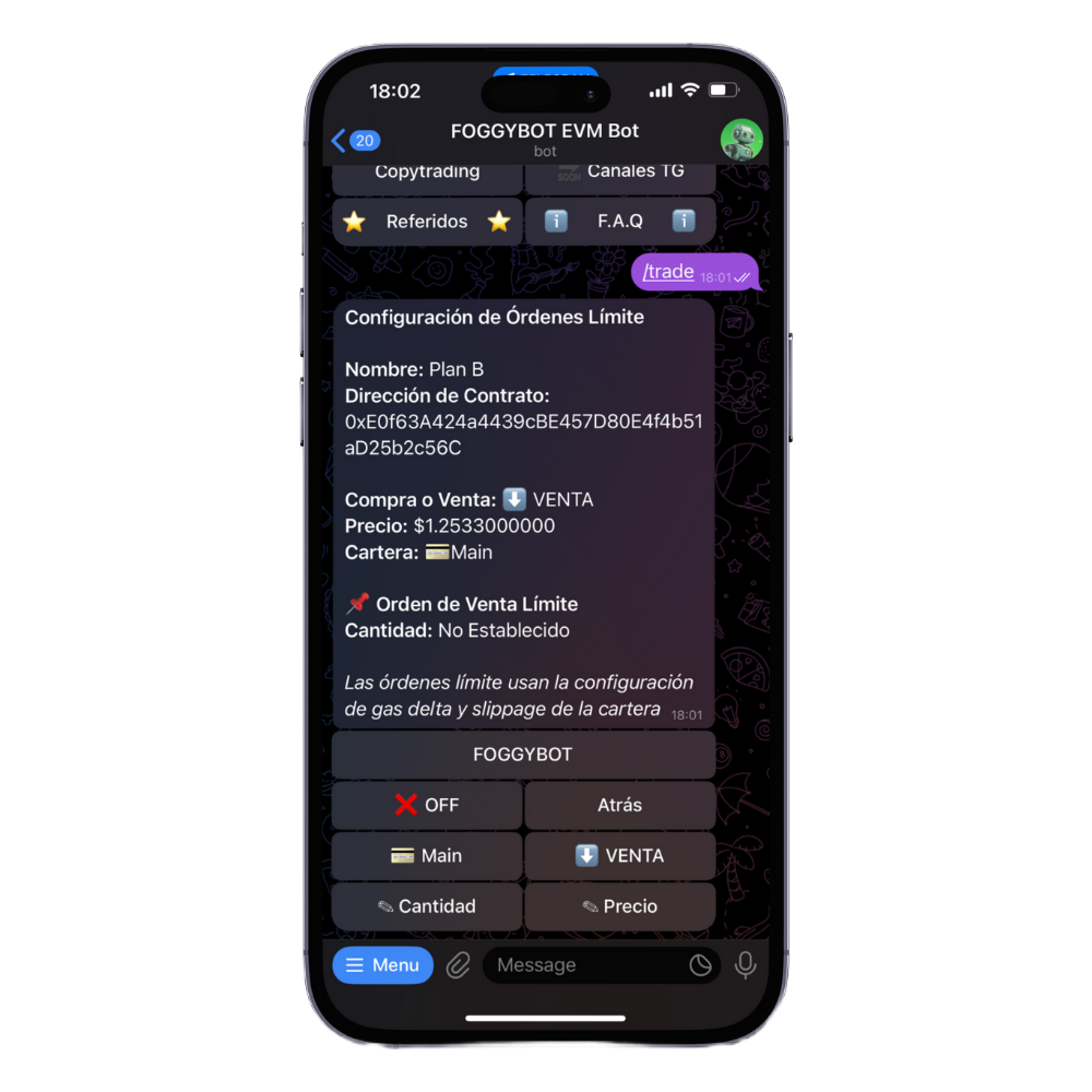 In the message you will see a list of your current limit orders if you have any. You can turn Limit Orders ✅ ON/ ❌ OFF by clicking the button and you can create limit orders by clicking ‘Add Limit Order’.