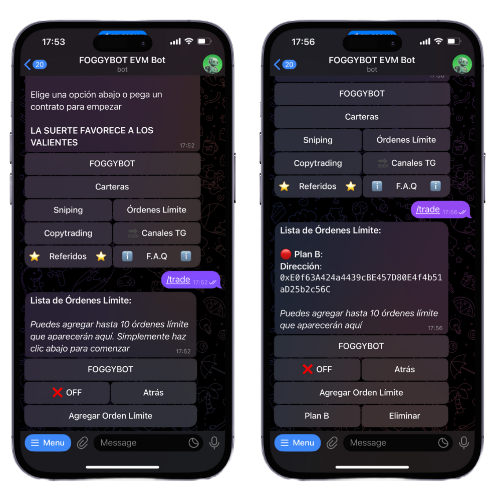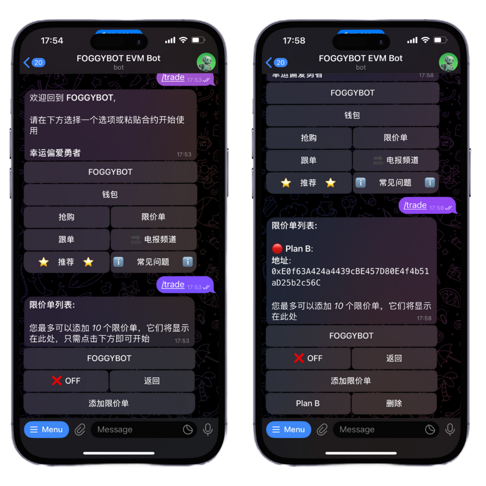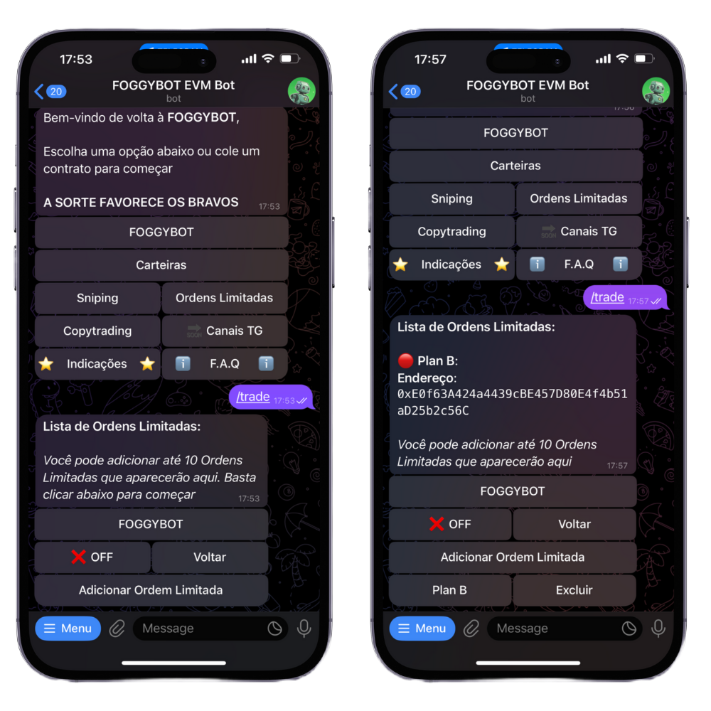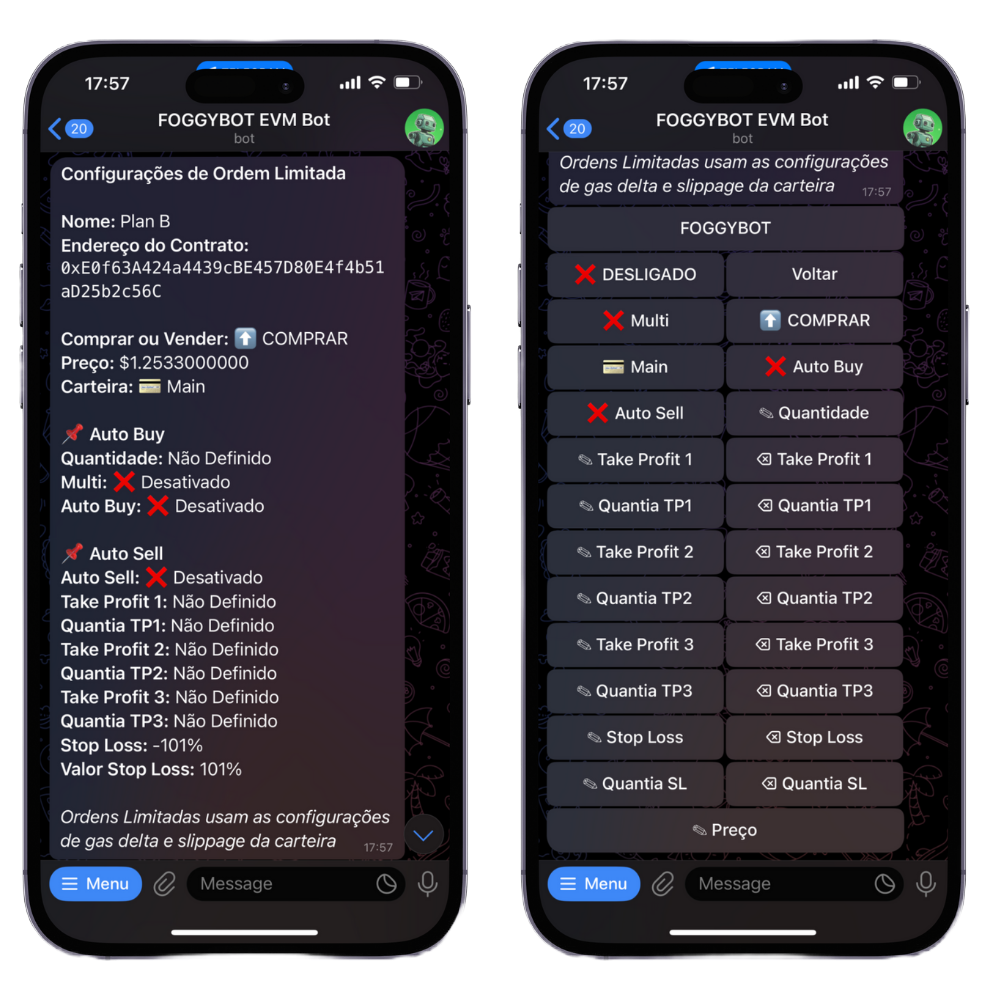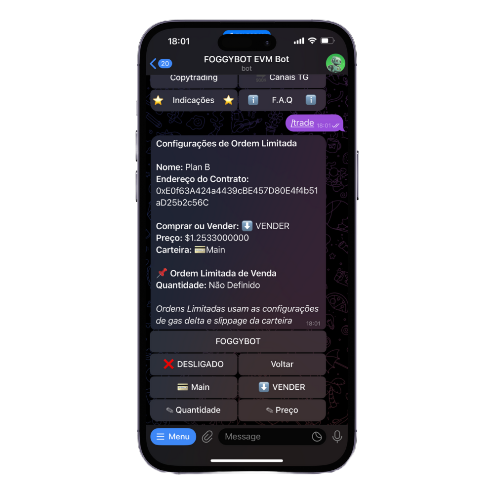 In the message you will see a list of your current limit orders if you have any. You can turn Limit Orders ✅ ON/ ❌ OFF by clicking the button and you can create limit orders by clicking ‘Add Limit Order’.