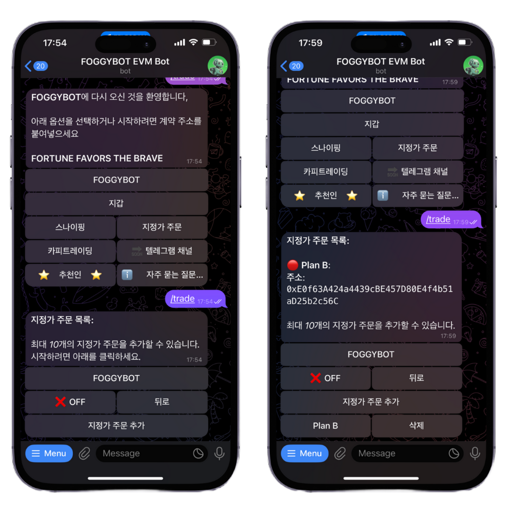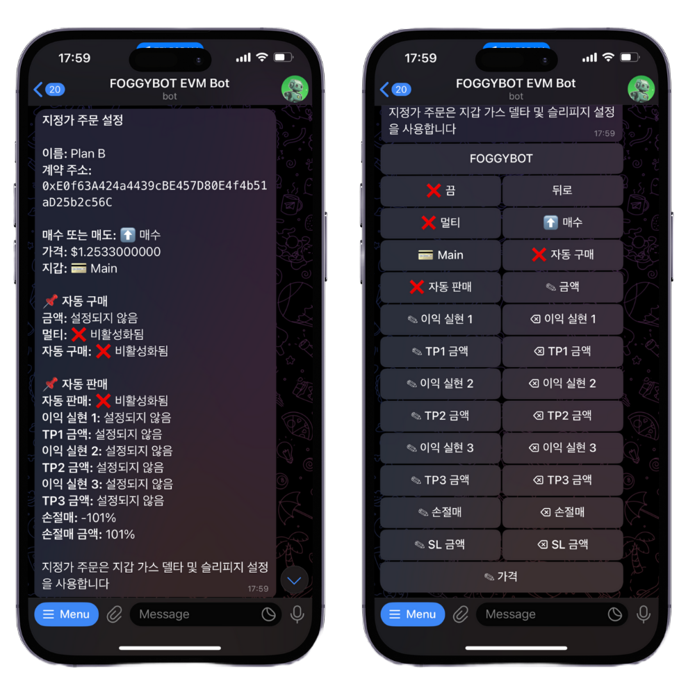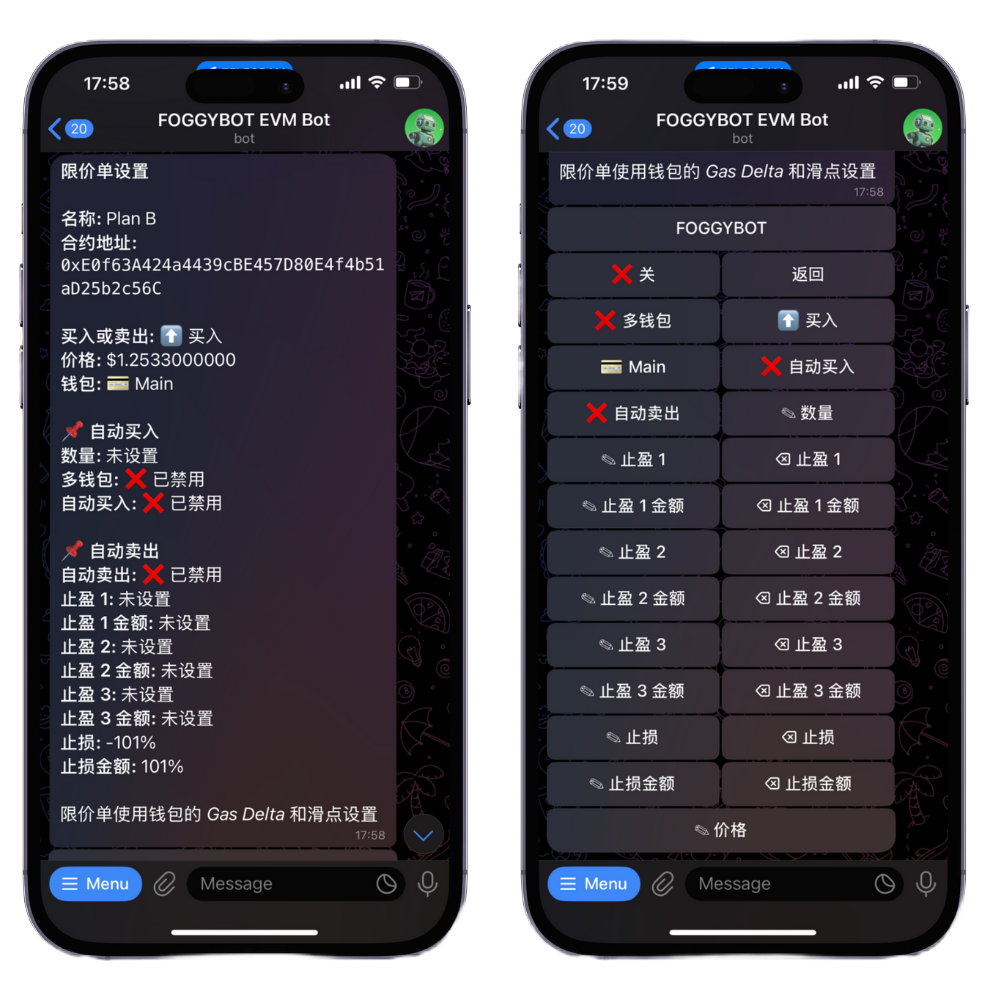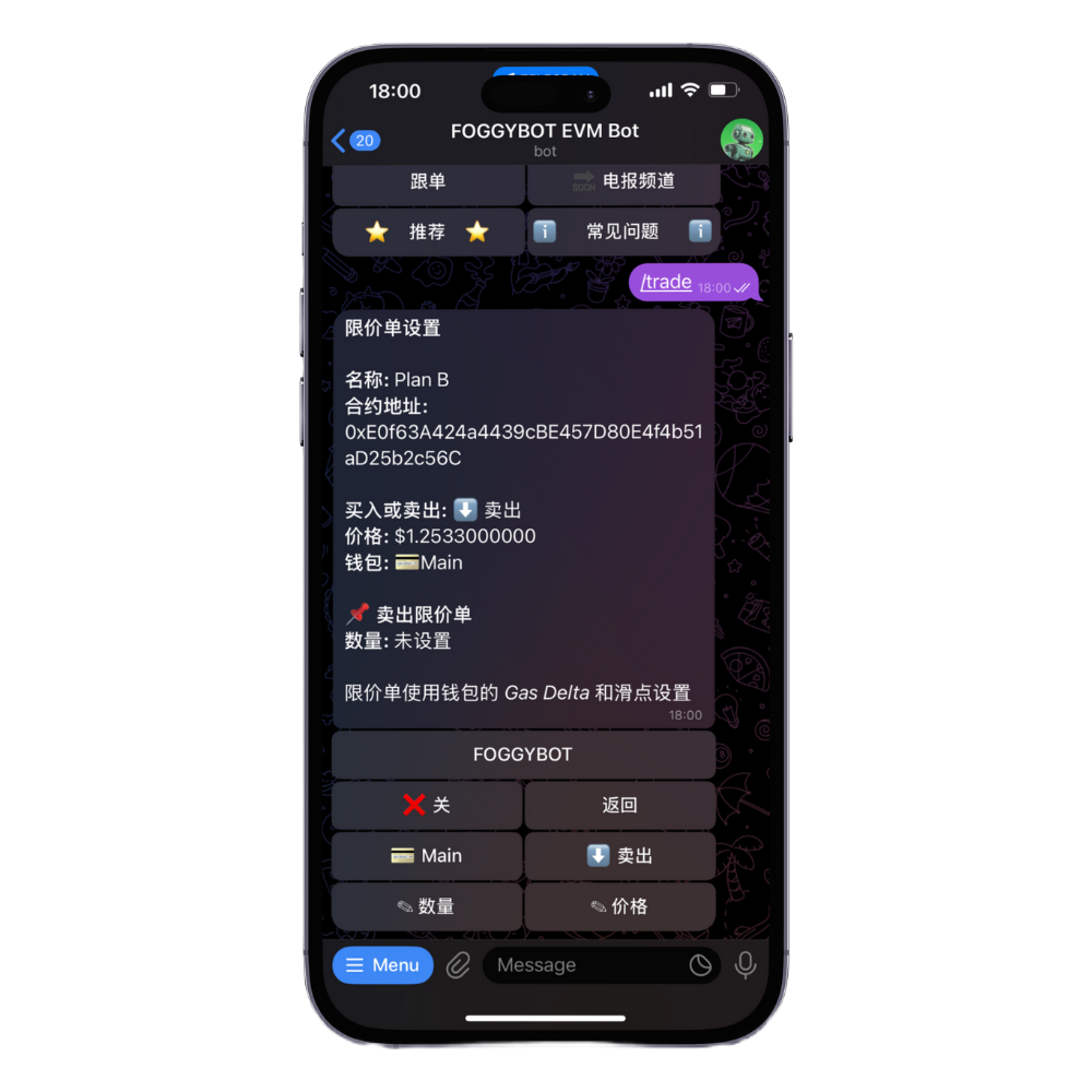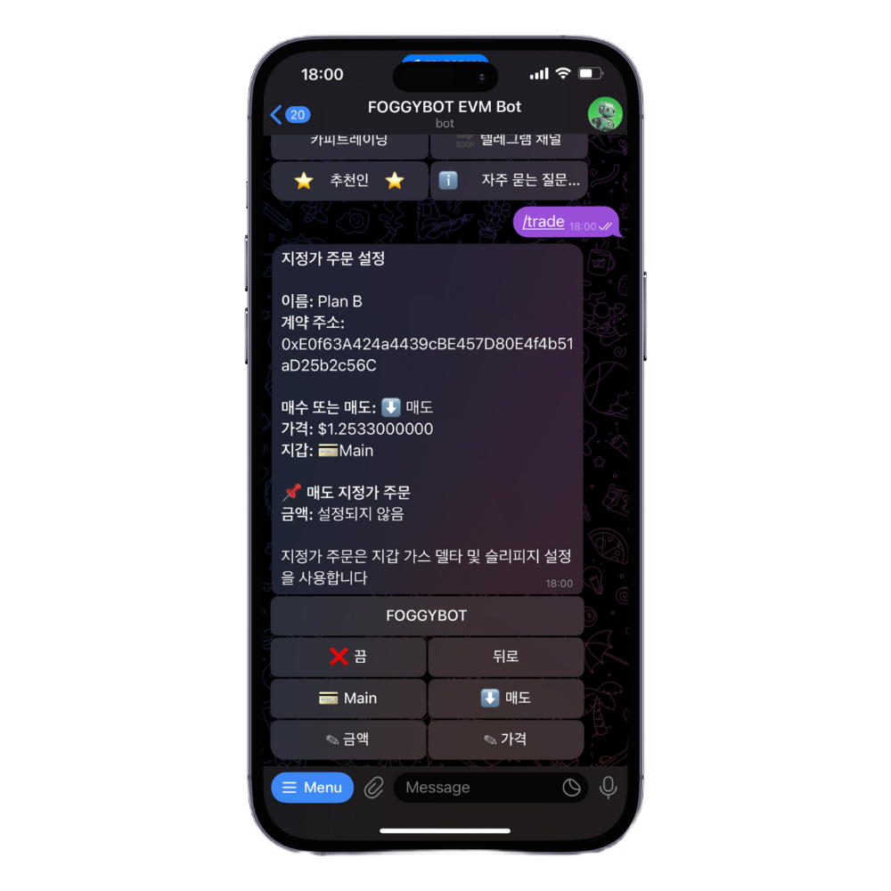 In the message you will see a list of your current limit orders if you have any. You can turn Limit Orders ✅ ON/ ❌ OFF by clicking the button and you can create limit orders by clicking ‘Add Limit Order’.