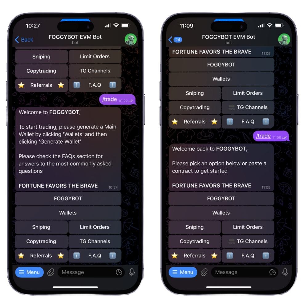 To start using the bot, head to either our EVM (ETH/BNB) or SOL bot and start, verify you are human with Safeguard, then go back to the bot, click trade & FOGGYBOT will then create a user for you and bring you to the page below: