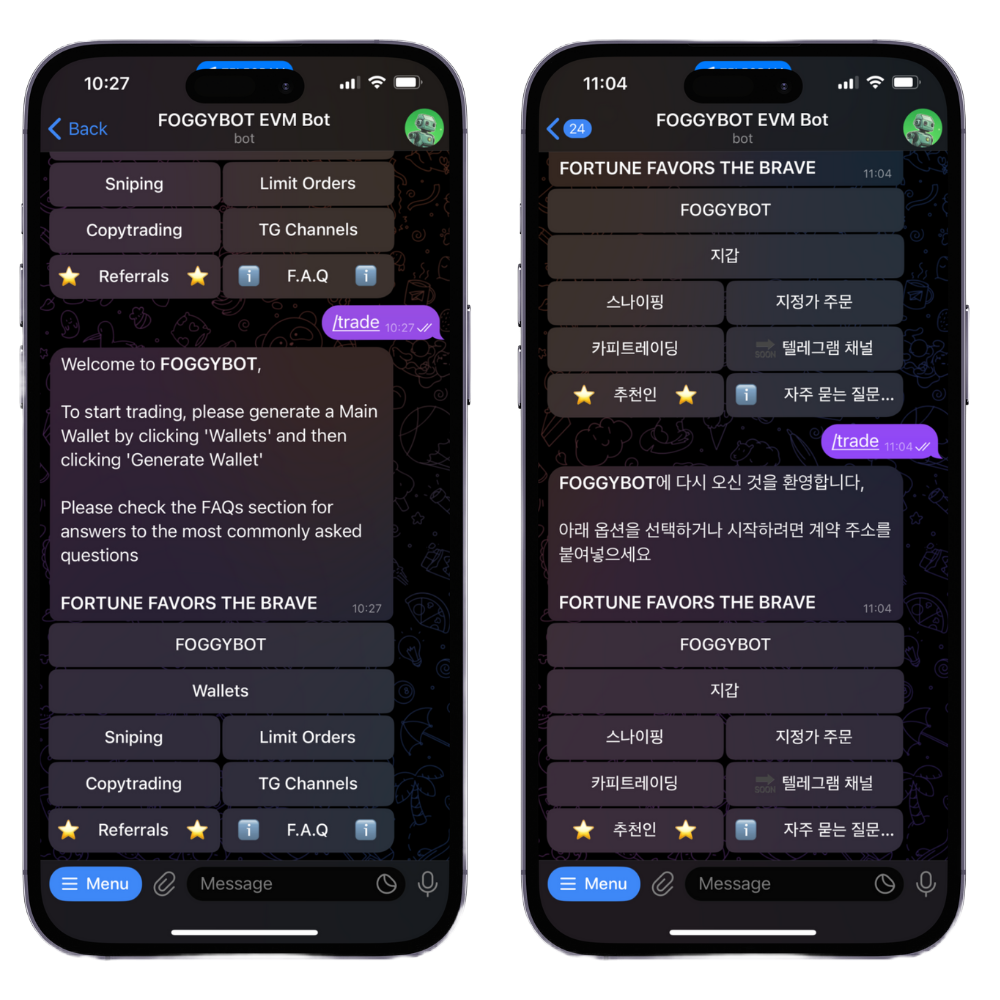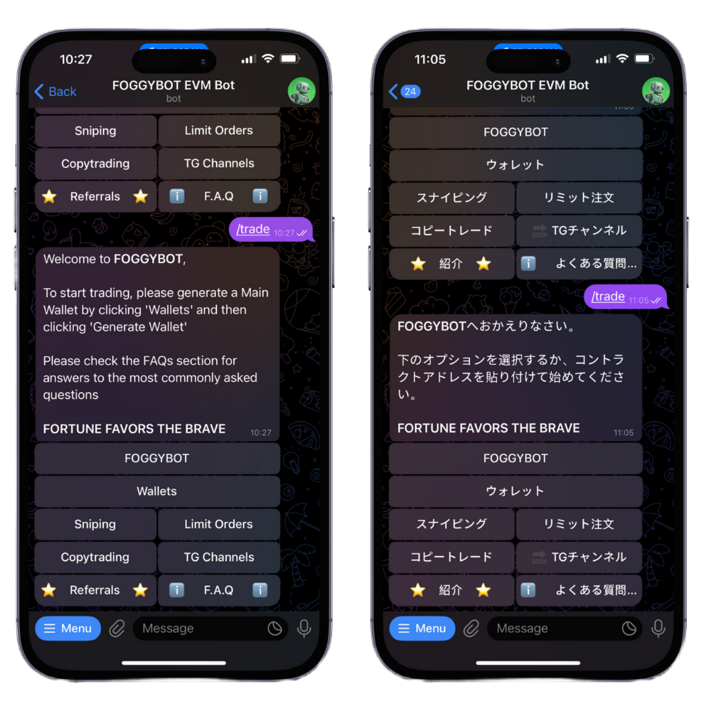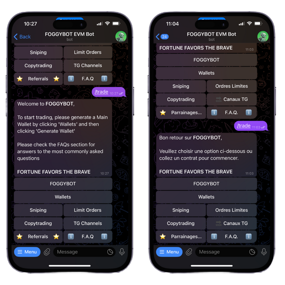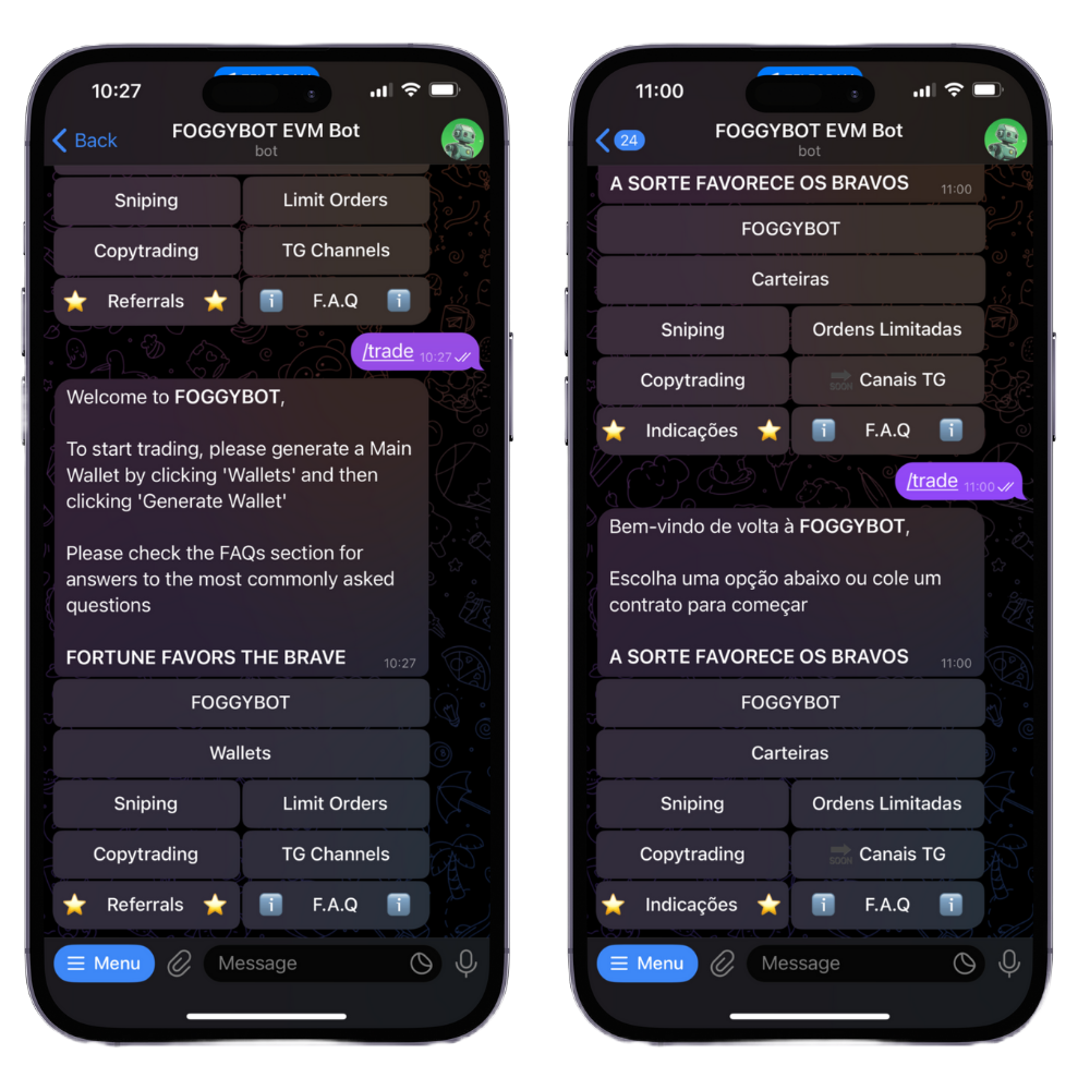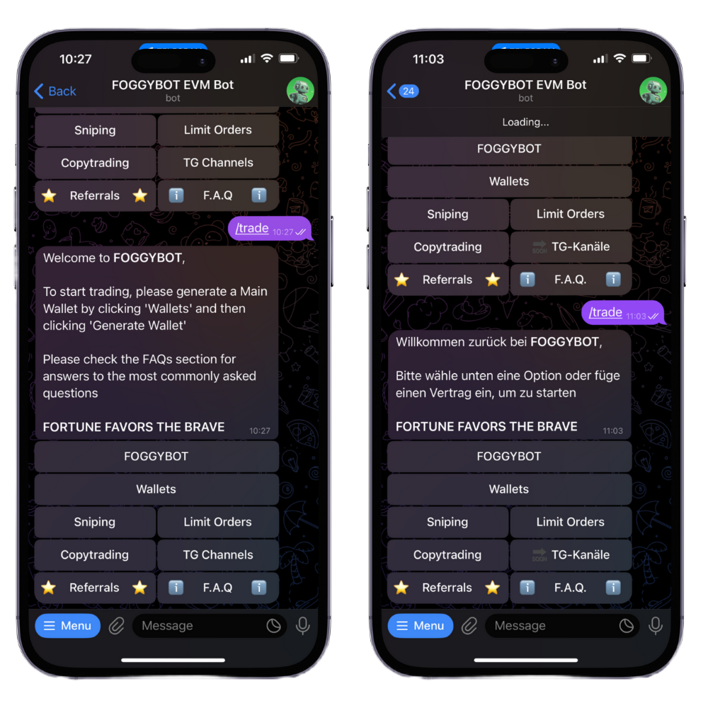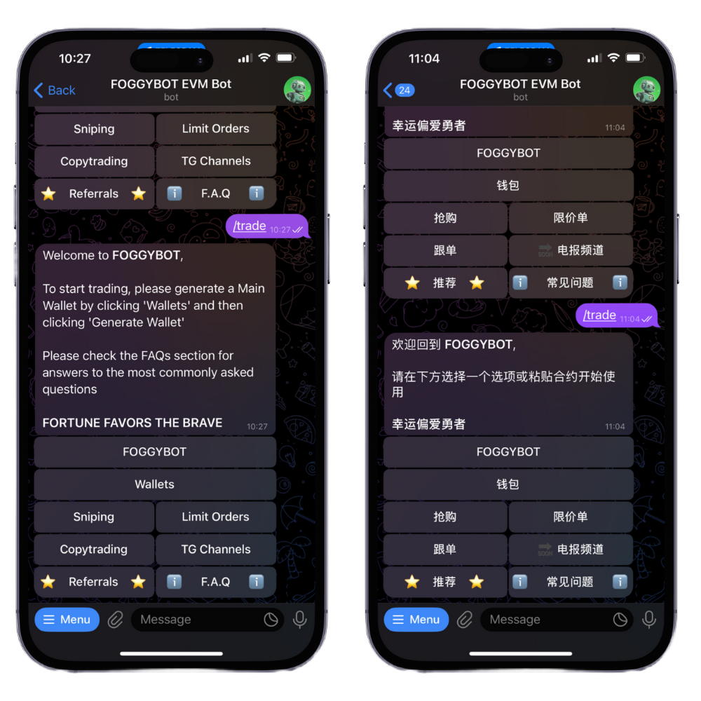 To start using the bot, head to either our EVM (ETH/BNB) or SOL bot and start, verify you are human with Safeguard, then go back to the bot, click trade & FOGGYBOT will then create a user for you and bring you to the page below: